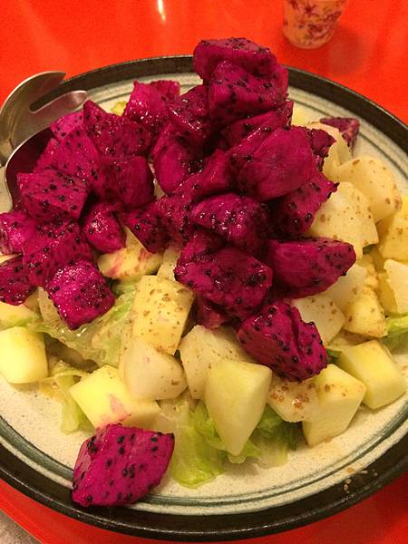 底下是胡麻醬沙拉,上面是水梨蘋果塊跟清甜美艷的紅火龍果。夏天來個這樣的水果沙拉簡直已經是飽足的一餐,但這只是開胃而已⋯⋯