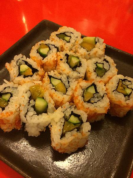 芒果卷-小巧ㄧ口的花卷有芒果甜香跟小黃瓜酥脆,加上海苔與蝦卵鮮味,也是清爽開胃小點。