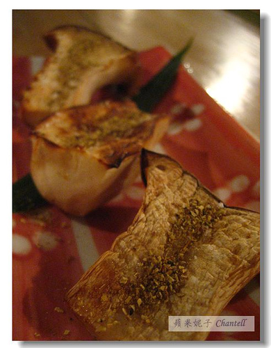 燭色的燈光修飾著元氣的藍色紮染布與竹牆的對比,簡單的裝飾讓小屋有著渾然天成的日本料理店感覺,吧台寬廣而乾淨,另一翼是面海的DINNING區,漂流木製的桌椅有著樸拙的美感與奇趣。 餐廳本身的環境美麗的讓我有些許不安:一開始就這麼美好的高潮,接下來會不會走下坡呢? 所幸餐廳的靈魂-主廚(以下簡稱大安)功力深厚,雖然接下來陸續擁進幾乎滿店的客人,還能忙而不亂的掌控著該有的火候與調味,同時從容的與坐在吧台前三組客人談笑風生(其中一組還特別煩人,就是我們,從六點吃到十一點多),從此處可看出此人不但心臟大顆,肯定也是見識過大風浪,眼前的RUSH與爾等小妖小魔完全不改其色,鎮定的掌控著每桌出菜順序。(要是在下RUSH起來肯定是疾言厲色又大呼小叫,先出肋排再給洋蔥圈….) 太陽下山以後,店長惠珊就是眼力所及的美景。本來想問她一直被人稱讚美麗會不會很膩,後來又覺得自己的問題實在俗氣(哪個女人會聽膩啊)。現榨原汁蜂蜜萊姆一壺270與餐點價格相比看似不便宜,但如果純用新鮮萊姆榨製成本實在不低,更別提所費人力,如果在惠珊備製飲料時不小心凝視那始終保持著、弧形完美的微笑,恐有目光發直、舌頭打結等未飲先醺之虞。 (warning:如果旁邊坐著正宮大人,恐有性命之虞) 烤杏鮑菇佐花椒鹽:正如同某句不知道哪讀來的話說,看不見的東西往往是最重要的。這看似普通的鹽是大安自己從第一道粗製鹽後自己加工精製的。烤透的肥厚菇體有著令人驚訝的彈性與多汁,本來擔心會過硬而在牙齒與之搏鬥時吸進花椒鹽而出糗的我,此時細細咀嚼著詮釋了『山珍』的此道作品,花椒鹽一點也不辛辣,帶著淡淡earthy(我實在不想翻譯成泥土香)的香氣,僅在杏苞菇滑落胃袋時在舌尖留下淡淡的刺激與微麻感。