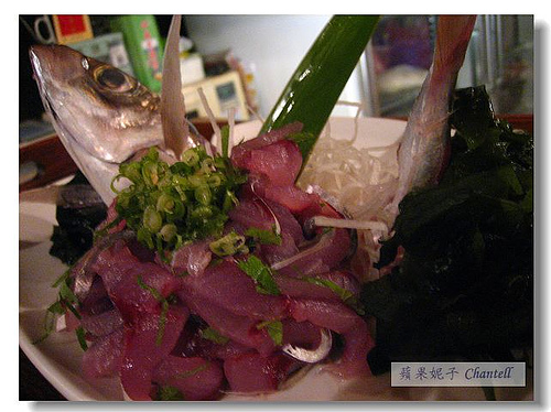 烤竹夾魚一夜干:原本就是大戶屋一夜干迷的我,至此完全省了一篇食記-如果已經吃到極品,之前便不堪一記。花蓮的竹筴魚擁有得天獨厚的肥厚魚體,體型直逼台北的兩倍(這是指魚姿造跟一夜干,至於炸的完全不能比,台北某店炸的簡直是魚苗)。恰到好處的鹽分完全沒有破壞魚肉的豐潤,口味清淡的我們不發一言直到整條魚幾乎被夾食殆盡,我才想到我竟然不需要用白飯來配,一方面是我很期待即將來臨的菜色,但又彰顯了恰如其分的鹽如何扮演著催化魚肉鮮甜的角色、鹹味卻絲毫不露痕跡。