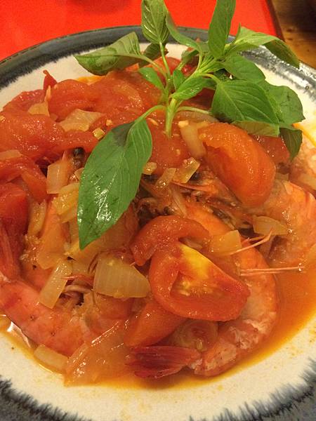 蕃茄,洋蔥與鳳梨燉煮了四個小時後,淋在大明蝦(下襯高麗菜葉)上蒸煮。蕃茄醬汁的酸香甜與蝦汁浸透了高麗菜葉,雖然明蝦蒸燉後肉質不Q彈,卻讓人允指回味無窮。