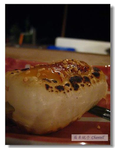 白田樂豆腐:嫩豆腐以重物壓製四小時,造成更緊實的口感與濃縮的豆香,白味增是日本進口再調製的。炭火烤出了略脆的外層,舌頭嚐到棉布造成的肌理時、撲鼻的是炭炙的香氣,這觸感不像是豆腐,倒像是一塊嫩極的肉,中間夾著烤溶的起司,因為豆腐芯仍是幼嫩無比,『好想用吸的的唷』一旁的星橋說著, 『妳不會吧?』語音剛落便聽見『啾~』的一聲,味增的豆香柔順溫潤,襯著這塊豆腐對唇舌造成的愉悅與誘惑力;近乎色情。只能說讀者諸君得親自去體會這脣齒之間近乎罪惡的愉悅,筆墨但不能書。